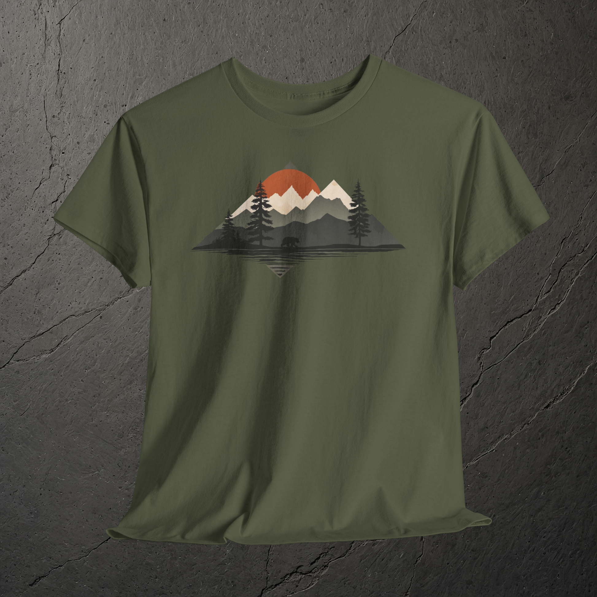 • Besonderheiten: Motiv mit klarer Spiegelung im Wasser und dezentem Bärenschatten, angelegt als ruhige Dreiecksform. Die Hero-Farbe Military Green verstärkt den Naturbezug, ohne vom Motiv abzulenken.