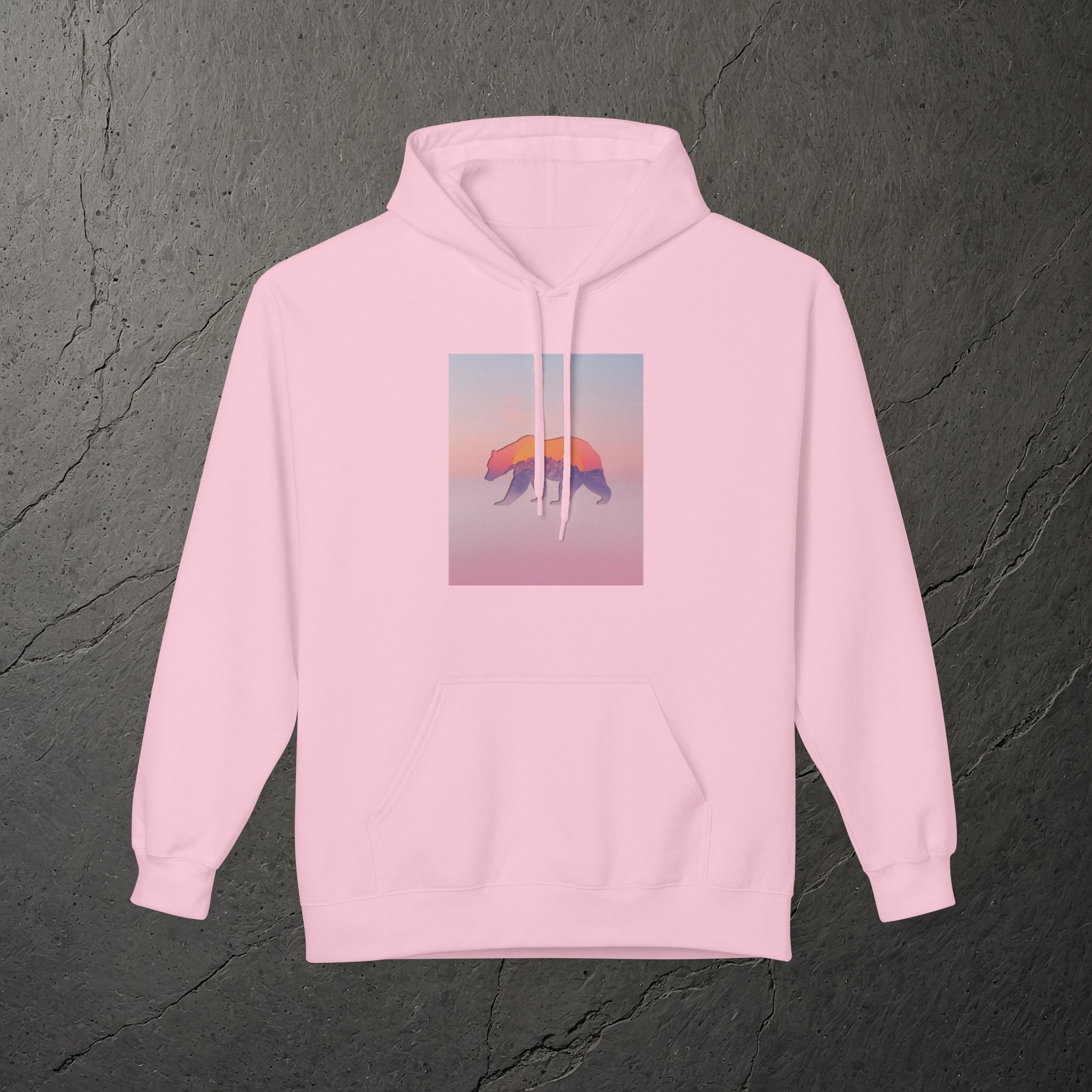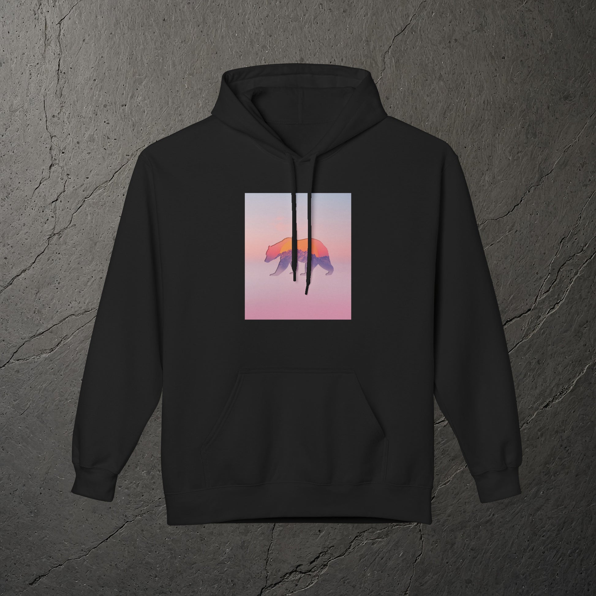 Ein Bär tritt aus einem Streifen Nebel hervor, sein Körper gefüllt mit einer Gebirgskette, die im letzten Licht des Tages liegt. Die warmen Orangetöne der Sonne gehen langsam in weiches Rosa und schließlich in ein stilles Blau über, sodass das Motiv wie ein kurzer, festgehaltener Übergang wirkt. Der Hoodie Abendglühen im Bärenfell nimmt diesen Moment auf und lässt viel Raum für das, was zwischen Tag und Nacht passiert. Ob auf dem Heimweg nach einer Tour, beim späten Gang zum Wasser oder einfach auf dem Sofa – das Stück begleitet Situationen, in denen es bewusst ruhig werden darf. Innerhalb der Kollektion 12: Bär × Gebirgspfad. Spuren der Ruhe. Kraft der Natur. steht dieses Motiv für den Blick zurück auf den Pfad, kurz bevor die Berge im Abendlicht verschwinden.