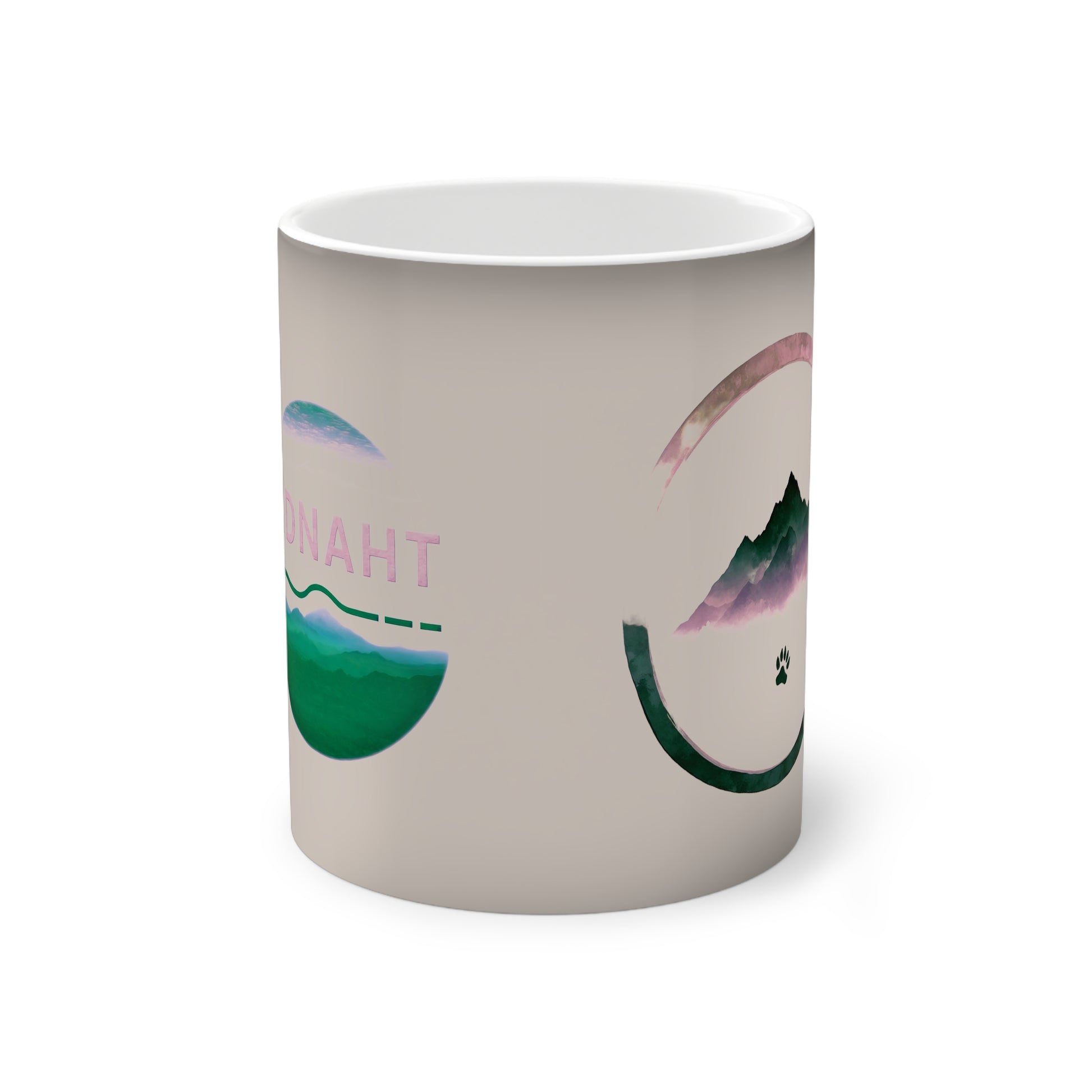 - Besonderheiten: Magic Mug mit Farbwechsel-Effekt: außen zunächst dunkel, bei heißem Inhalt erscheinen Logo-Seite und Bergkreis mit Bärenspur. Zwei Motive, die sich gegenüberliegen und die Naht zwischen Erde und Natur ruhig erzählen.