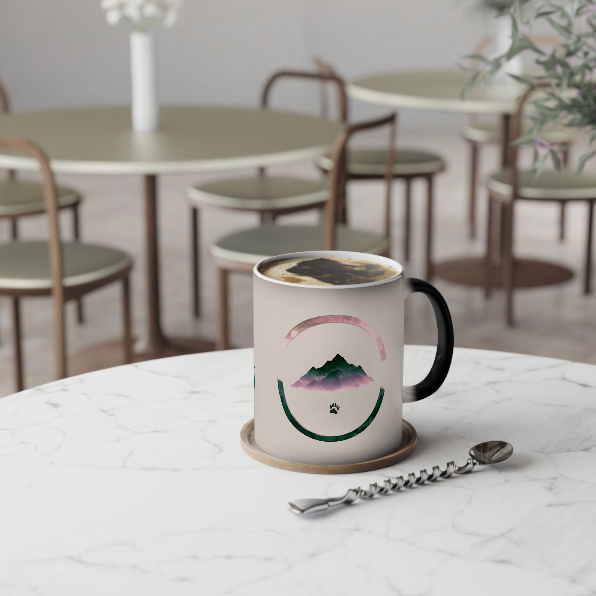 Im kalten Zustand wirkt die Tasse dunkel und geschlossen, als läge noch Nacht über dem Pfad. Mit dem ersten heißen Getränk löst sich die Fläche, und Spur im Morgennebel tritt hervor: weiche Bergkonturen im Grün, ein heller Himmel, eine feine Linie, die wie ein Weg durch das Motiv führt. Auf der Gegenseite steht die Bergsilhouette im Ring, darunter eine kleine Bärenspur – ein stiller Hinweis auf Kraft und Richtung. So entsteht ein Moment, in dem der Blick am Rand des Gebirges hängen bleibt, noch bevor der Tag laut wird. Die Tasse fügt sich in die Kollektion 12: Bär × Gebirgspfad – Spuren der Ruhe. Kraft der Natur. ein und begleitet ruhige Morgenrituale, kurze Pausen und Abende nach langen Wegen, ohne sich in den Vordergrund zu drängen.
