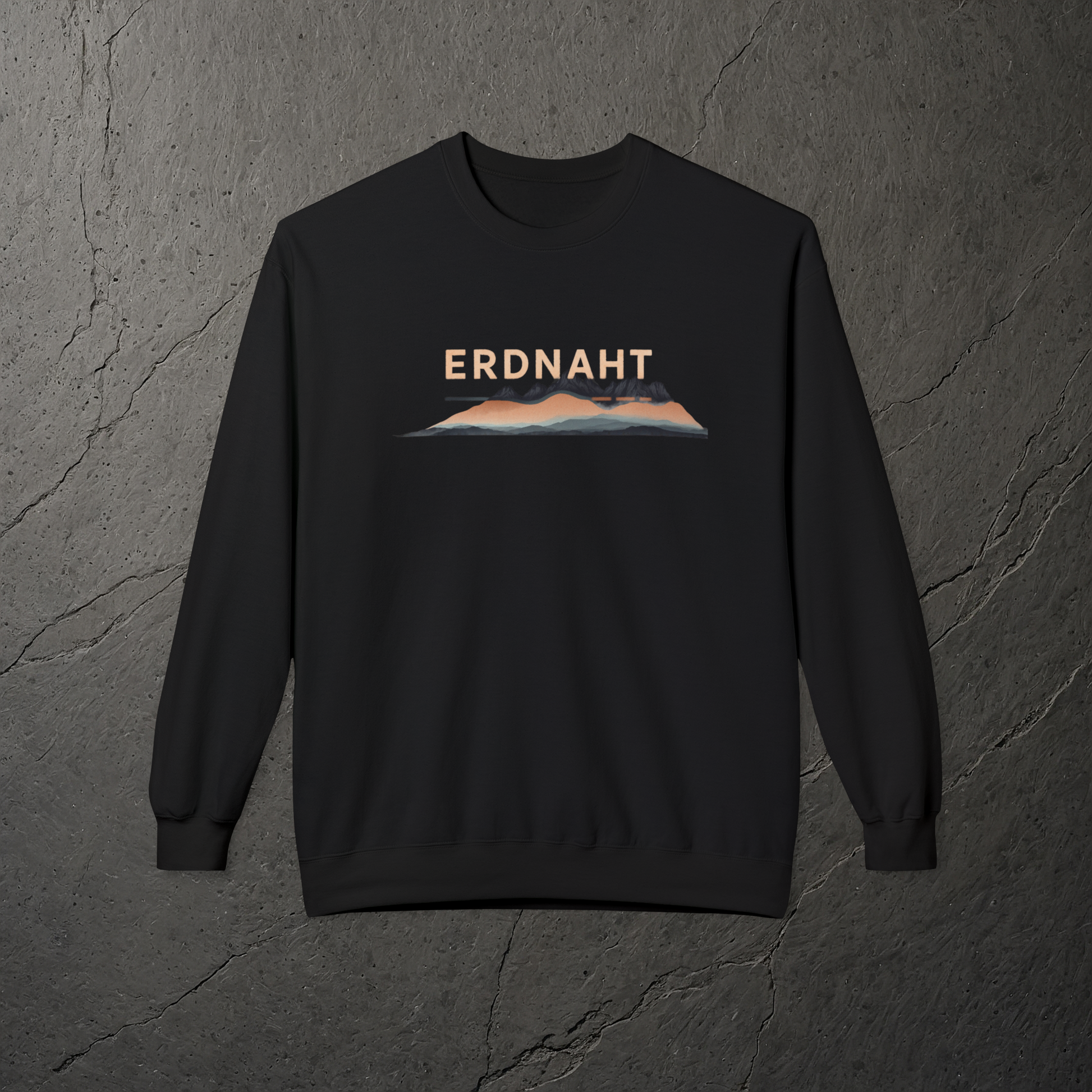 Die Grafik auf Leiser Grat legt sich wie ein stiller Horizont über die Brust: ein flacher Bergzug, zarte Übergänge von warmem Orange zu kühlem Blau, darüber der klare Schriftzug ERDNAHT. Das Sweatshirt erinnert an den Moment, in dem die Sonne hinter den Gipfeln verschwindet und die Konturen leiser werden. In diesem Rahmen setzt Kollektion 12: Bär × Gebirgspfad. Spuren der Ruhe. Kraft der Natur. auf ruhige Linien statt lauter Symbole. Das Motiv bleibt schmal geführt, lässt viel Raum für Stoff und Bewegung und fügt sich unauffällig in den Alltag ein. Ob auf dem Weg ins Wochenende, nach der Tour im Tal oder zu Hause auf dem Sofa – der <u>Grat</u> bleibt als leise Orientierung im Blick.