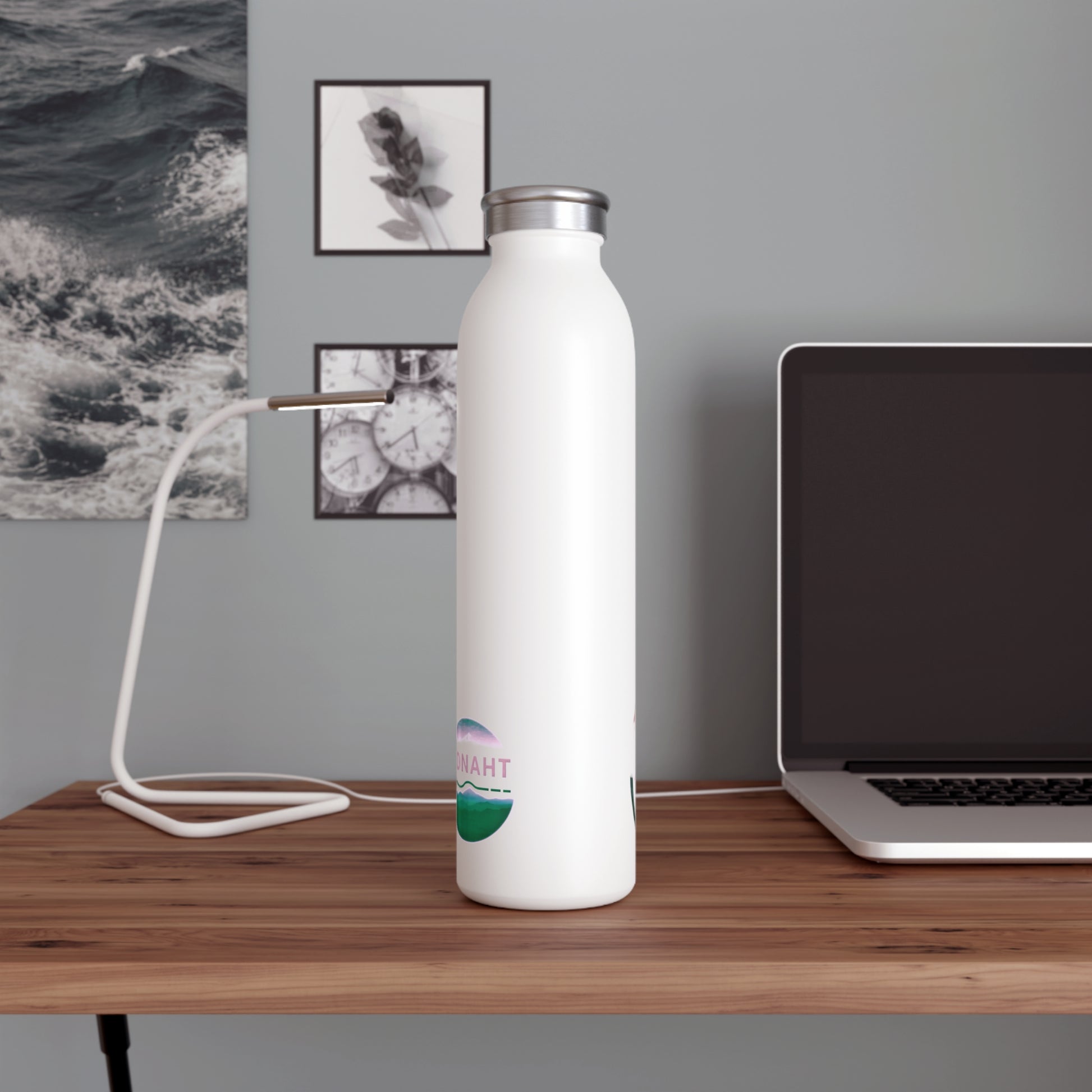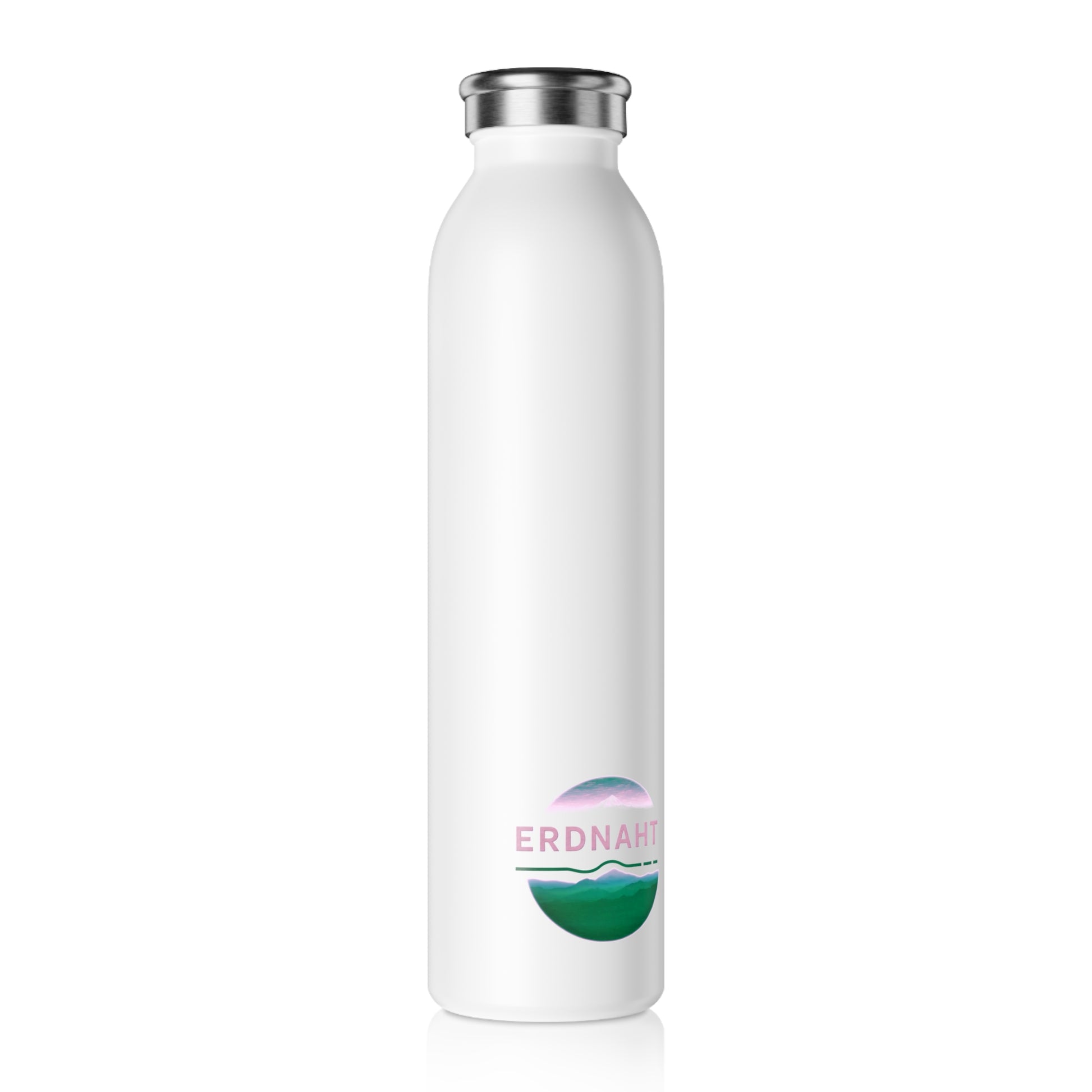 Im Motiv dieser Flasche liegt ein stiller Morgen über den Bergen. Die obere Hälfte zeigt eine diffuse, helle Nebelschicht, darunter zeichnen sich klare Bergkanten und ein sanfter Verlauf ins Grün der Täler ab. In der Kreisform entsteht so ein ruhiger Ausschnitt, der an erste Schritte auf einem kaum betretenen Pfad erinnert; die kleine Bärenspur am unteren Rand greift diese Idee leise auf. In der Hand wirkt die weiße, matte Flasche klar und unaufgeregt, das Motiv bleibt komprimiert und lässt viel frei gehaltene Fläche. Im Kontext von Kollektion 12: Bär × Gebirgspfad. Spuren der Ruhe. Kraft der Natur. steht „Spur im Morgennebel“ für Momente, in denen der Tag noch offen ist und jede Entscheidung bewusst getroffen werden kann. So wird die Flasche zu einem ruhigen Begleiter für Wasserpausen zwischen Schreibtisch, Wegstrecken und kleinen Auszeiten im Freien.